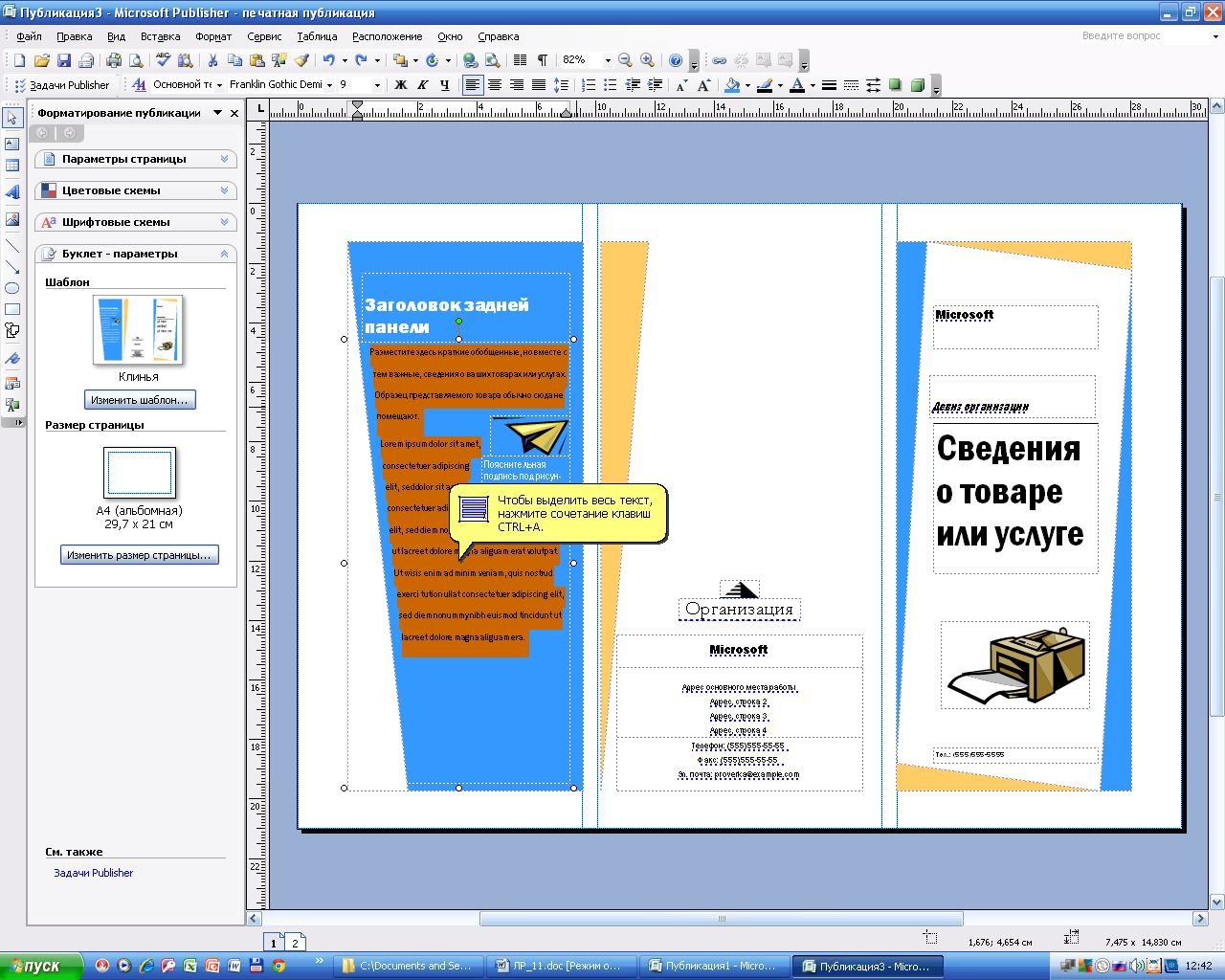 Создайте Буклет. В области задач выберите тип публикаций Буклеты, макет Клинья, цветовая схема Прерия, щелкните по кнопке Создать