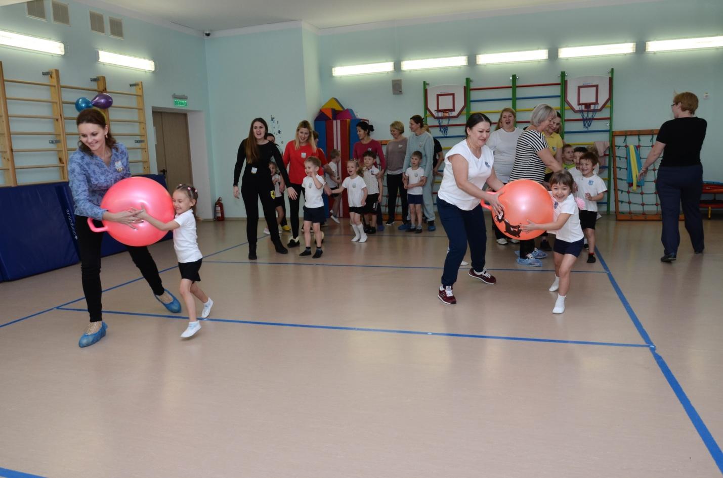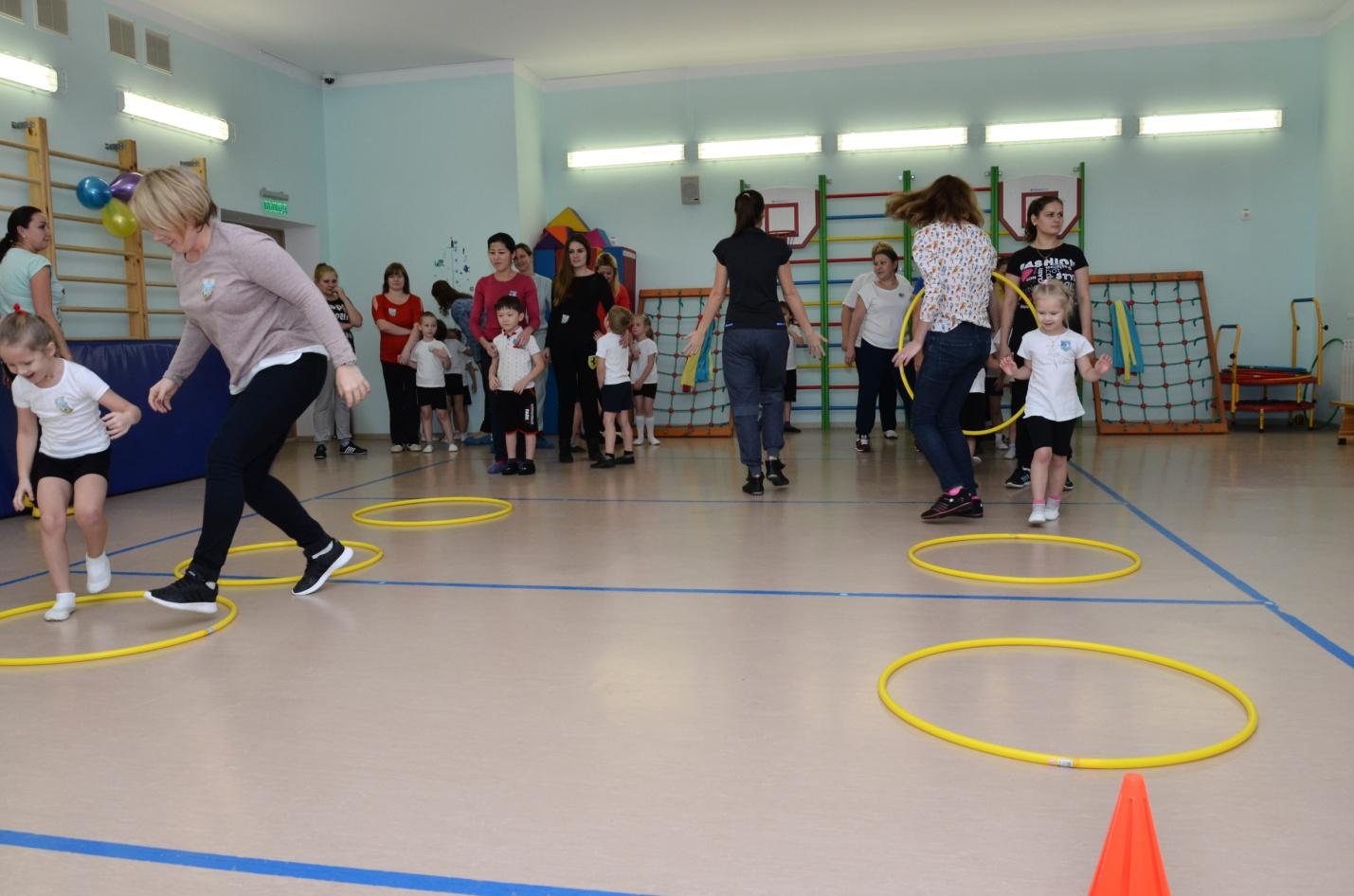 Мамы вместе с детьми строятся по командам для проведения эстафет.
