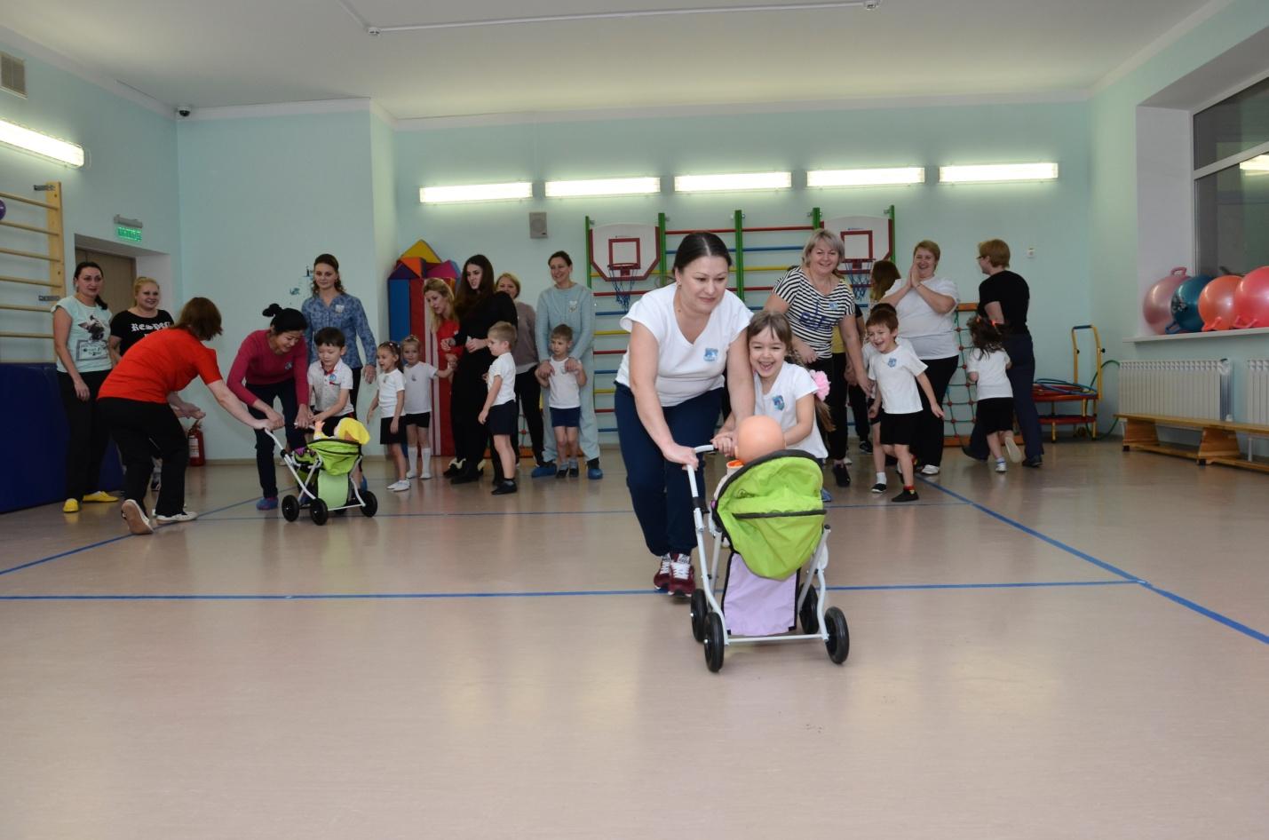 Задание: Мамы вместе с ребенком везут коляску с куклой вокруг конуса и обратно, стараясь при этом не уронить куклу.