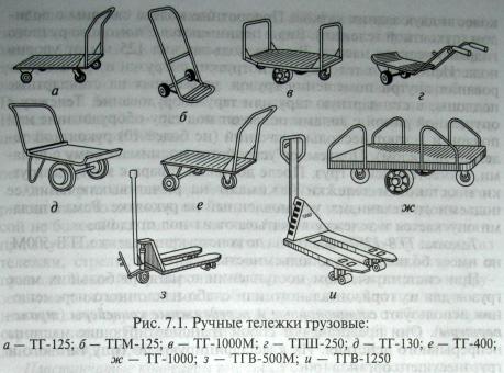 Рис 3. Грузовые тележки представляют собой раму с колесами, на которой укрепляют приспособления (платформу или вилы), предназначенные для поддержания товаров при перемещениях. К раме тележки крепится ручка для ее передвижения. Конструктивно ручные грузовые тележки выпускают с двумя, тремя и четырьмя колесами, со стационарной или подъемной платформой. Колеса тележек вращаются не только в горизонтальной, но и в вертикальной плоскости. Они бывают с ручным или механическим приводом. Каждый тип тележек имеет буквенное и цифровое обозначение, например: ТГ-50 — тележка грузовая для перемещения тарно-штучных грузов; ТГВ-100 — тележха грузовая с подъемными вилами и т.д.