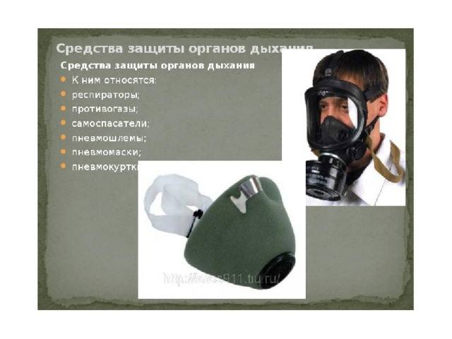 - Противогаз или иное средство индивидуальной защиты органов дыхания.