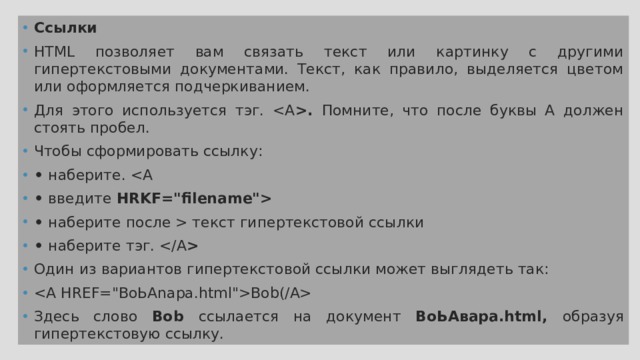 - Здесь слово Воb ссылается на документ ВоЬАвара.html, образуя гипертекстовую ссылку.