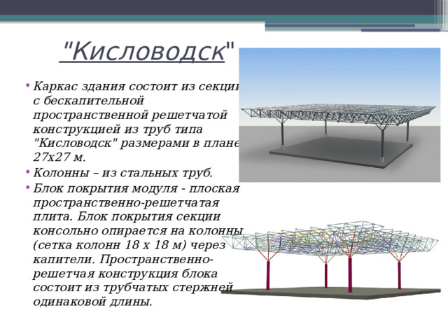 - Каркас здания состоит из секций с бескапительной пространственной решетчатой конструкцией из труб типа "Кисловодск" размерами в плане 27х27 м.
