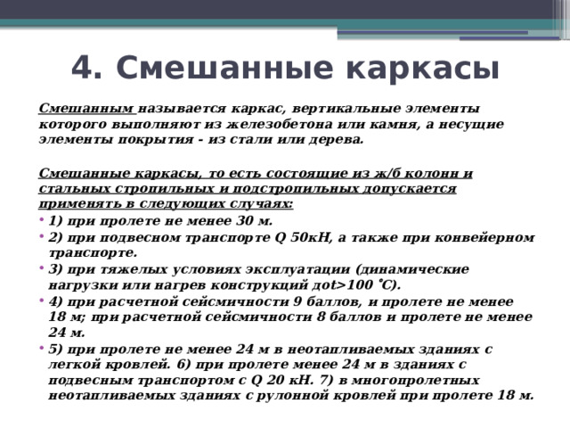 Смешанные каркасы, то есть состоящие из ж/б колонн и стальных стропильных и подстропильных допускается применять в следующих случаях: