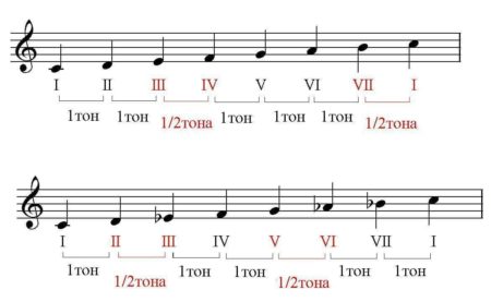 Разница здесь прячется между ступенями звуковых рядов. Они могут отличаться на половину или на целый тон.