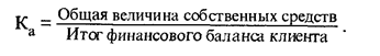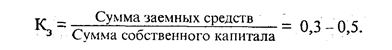 Оптимальное значение Ка — 0,5—0,6. Это означает, что сумма собственных средств заемщика должна составлять примерно половину всех средств предприятия. Коэффициент характеризует интересы учредителей, владельцев акций и кредиторов, отражает финансовую структуру средств, которая выражается в невысоком удельном весе заемного капитала и более высоком уровне фондов, обеспеченных собственными средствами. Это является защитой от потерь в периоды депрессии и гарантией получения кредитов.