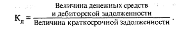 Модификацией Кал является коэффициент ликвидности (Кл), который представляет собой отношение суммы средств высокой и средней ликвидности к краткосрочной задолженности. (21.18)