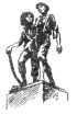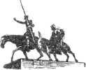 перёд устремлён длинный рыцарь на тощем коне (хитроумный идальго Дон Кихот Ламанческий на Росинанте); рядом его верный оруженосец Санчо Панса. Памятник установлен в Мадриде на площади Испании.