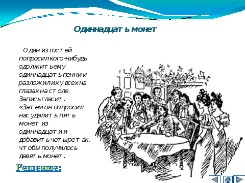Трюк в данной головоломке заключался в следующем. Из одиннадцати монет удаляется пять, затем добавляются четыре монеты (к этим уже удаленным), и у вас получается девять монет — во второй кучке удаленных монет!