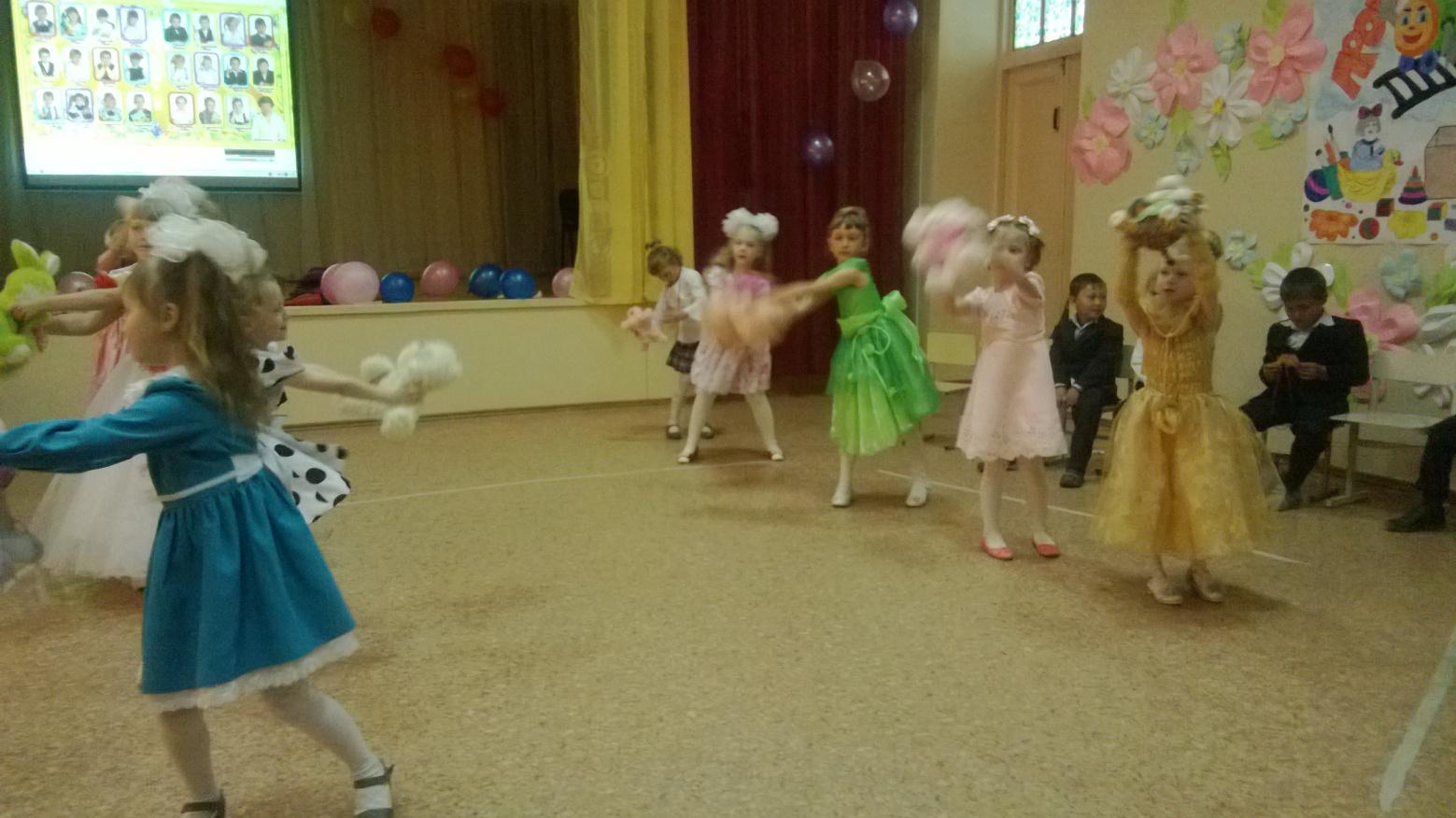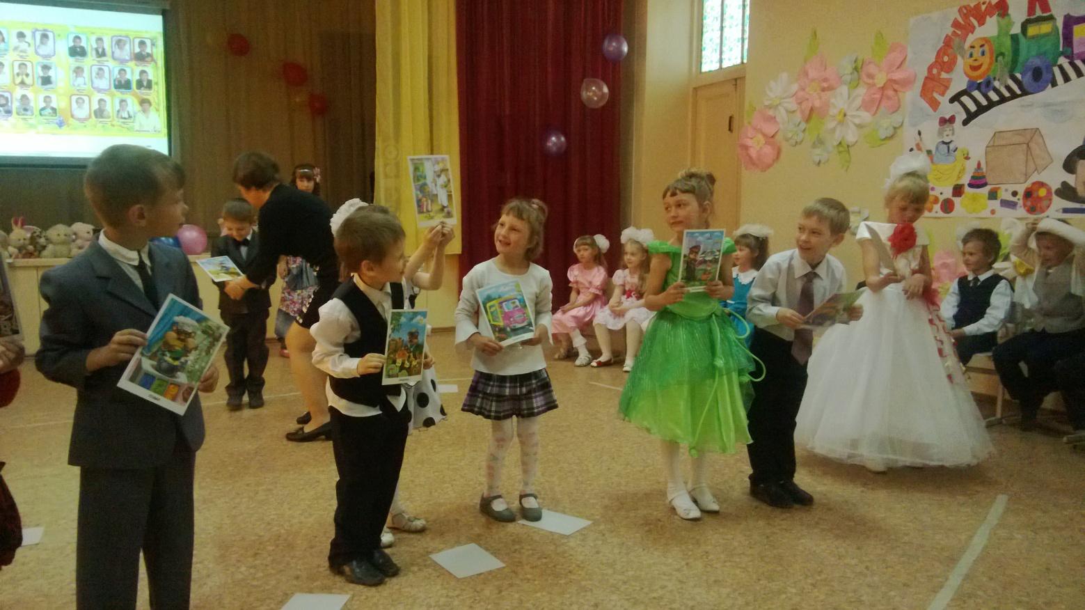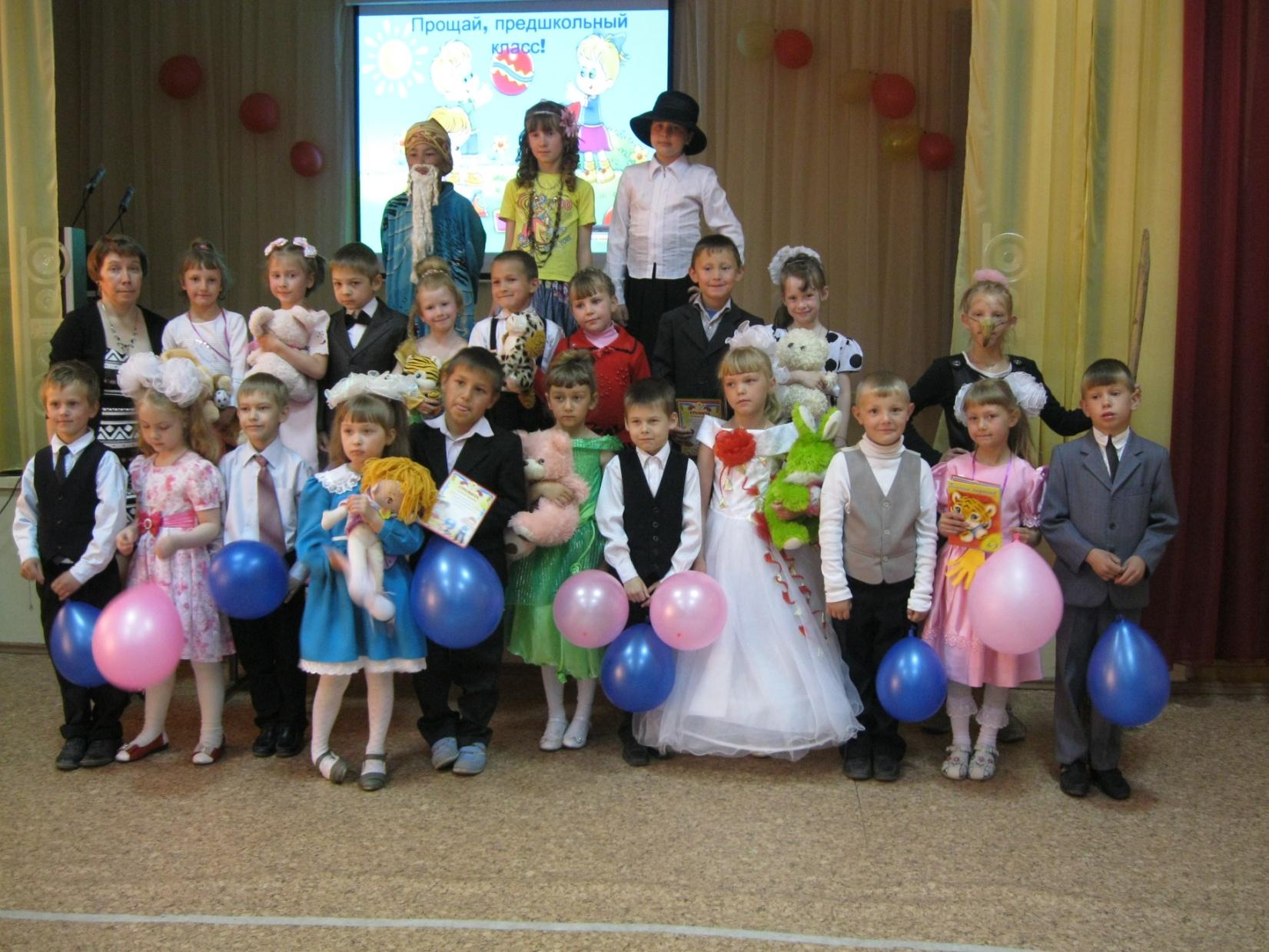 Оформление: на мультимедийной доске надпись «Прощай, предшкольный класс!», на стене детские картинки, воздушные шарики, цветы.