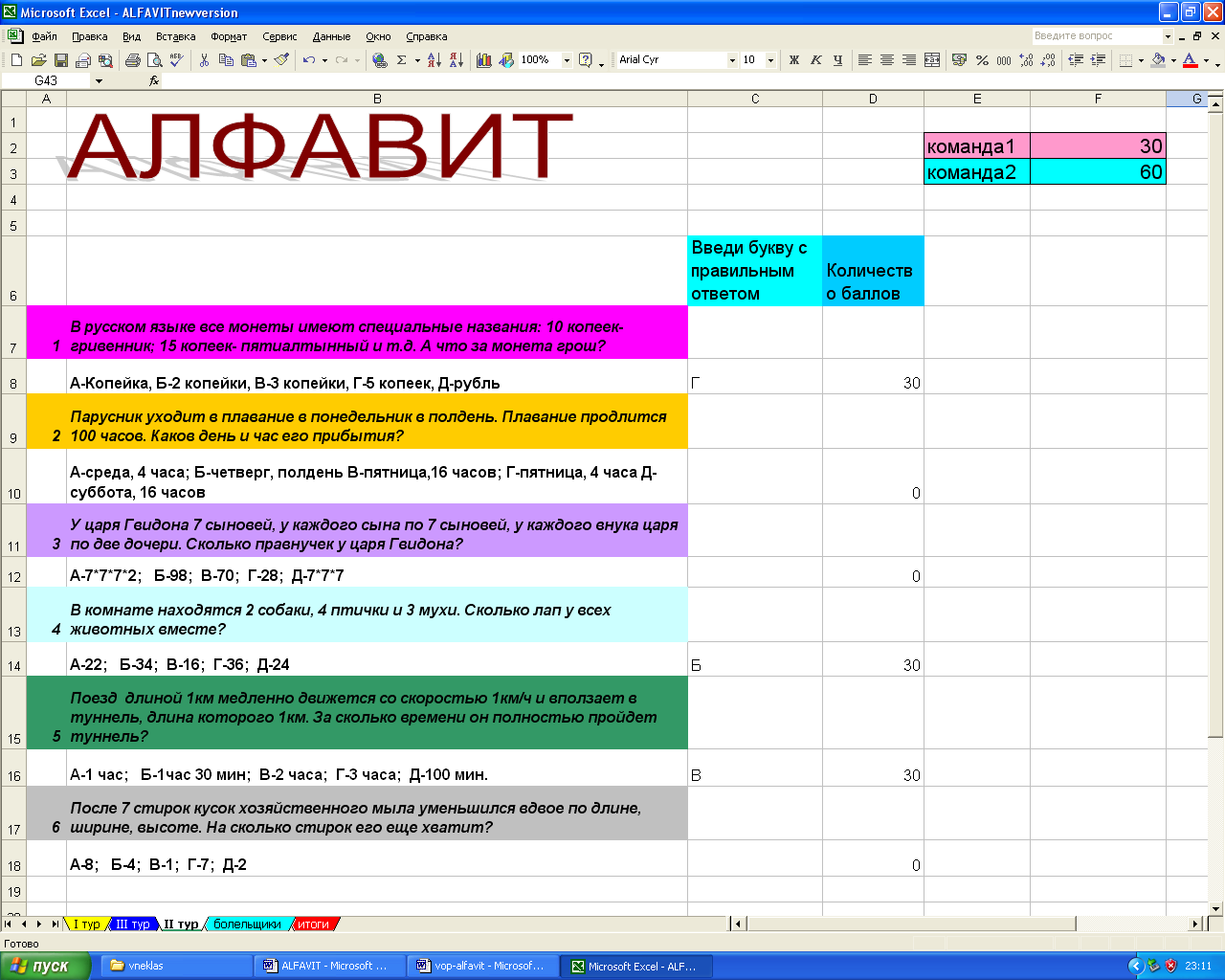 Во время составления слов проводится конкурс болельщиков, которые могут добавить очки своим командам, ответив правильно на задаваемые учителем вопросы (Приложение 2). Каждый верный ответ оценивается в 10 баллов.