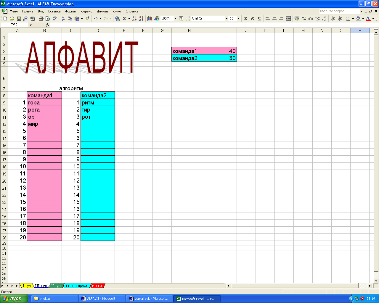 В третьем туре «Наборщик» команды составляют из букв слова «алгоритм » новые слова. На это им отводится 3 минуты. Составленные слова участники соревнования произносят по очереди. За каждое слово команда получает по 10 очков. По окончании тура подводится итог.