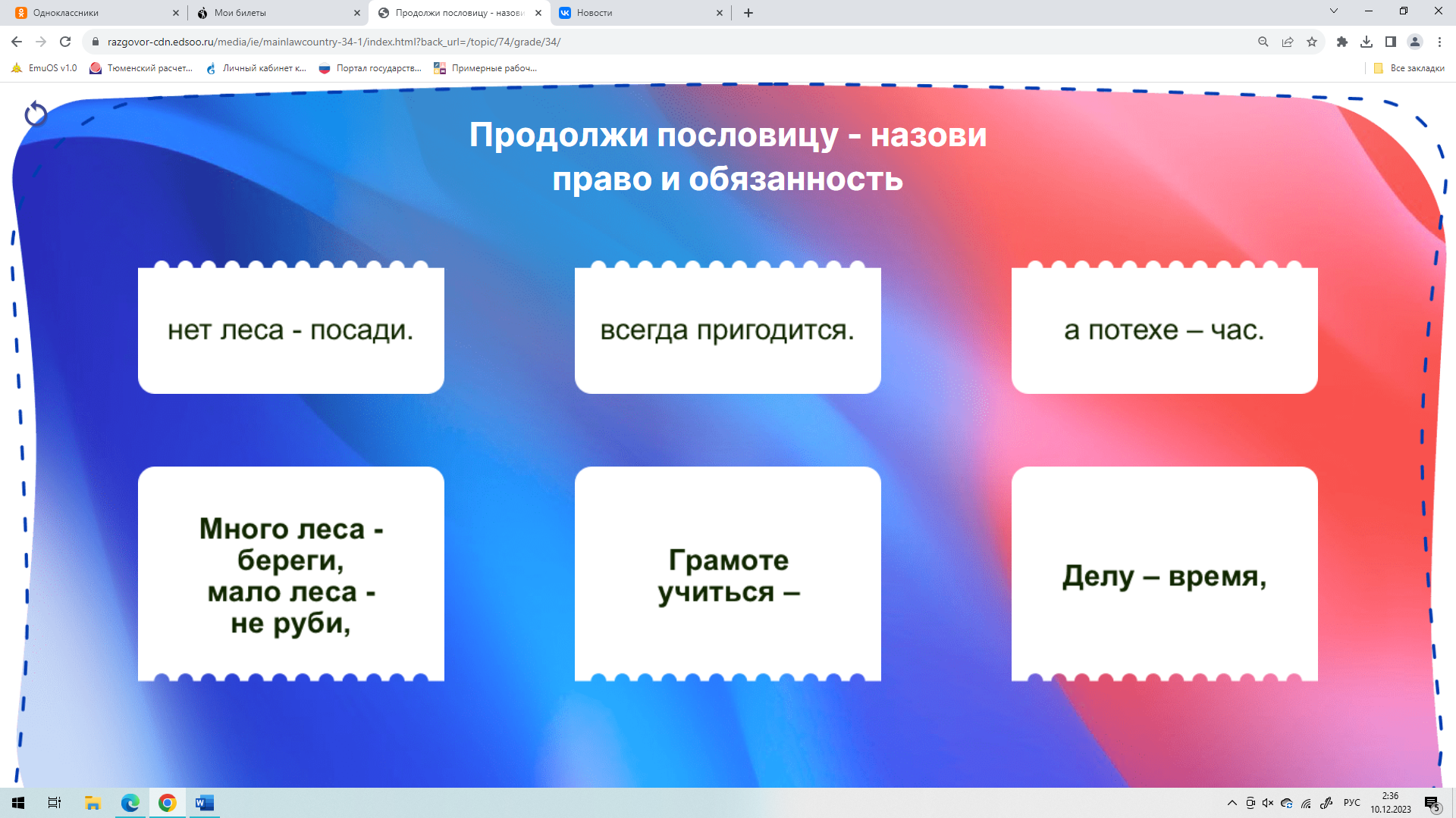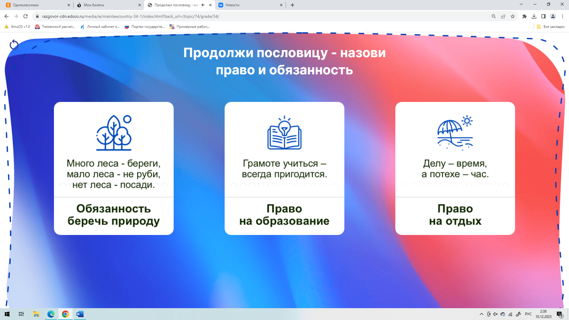 Интерактивное задание № 1 «Продолжи пословицу – назови право».