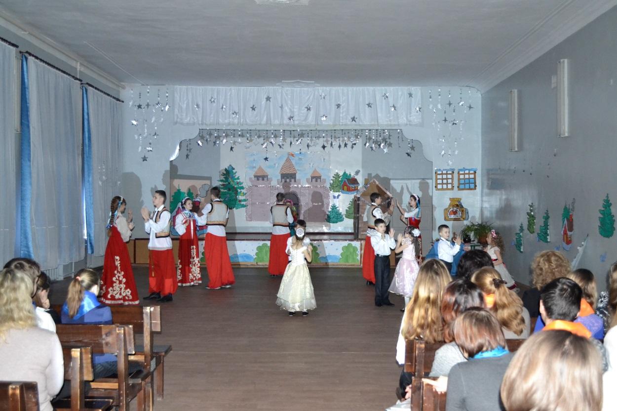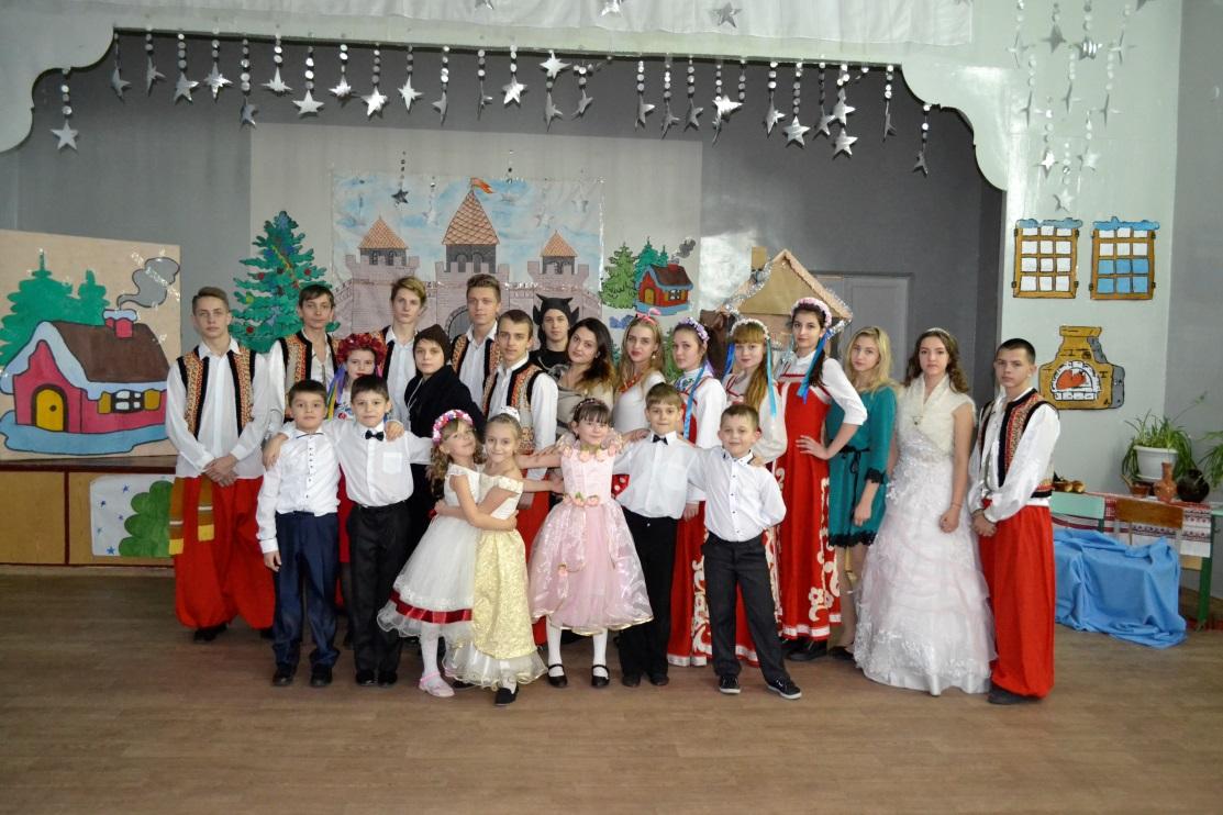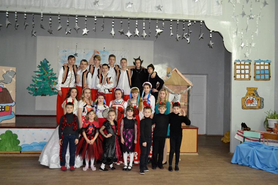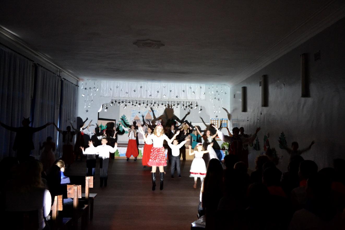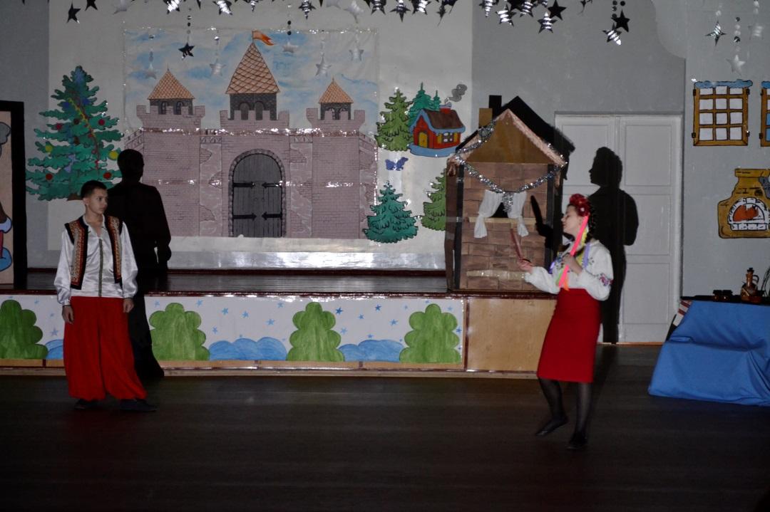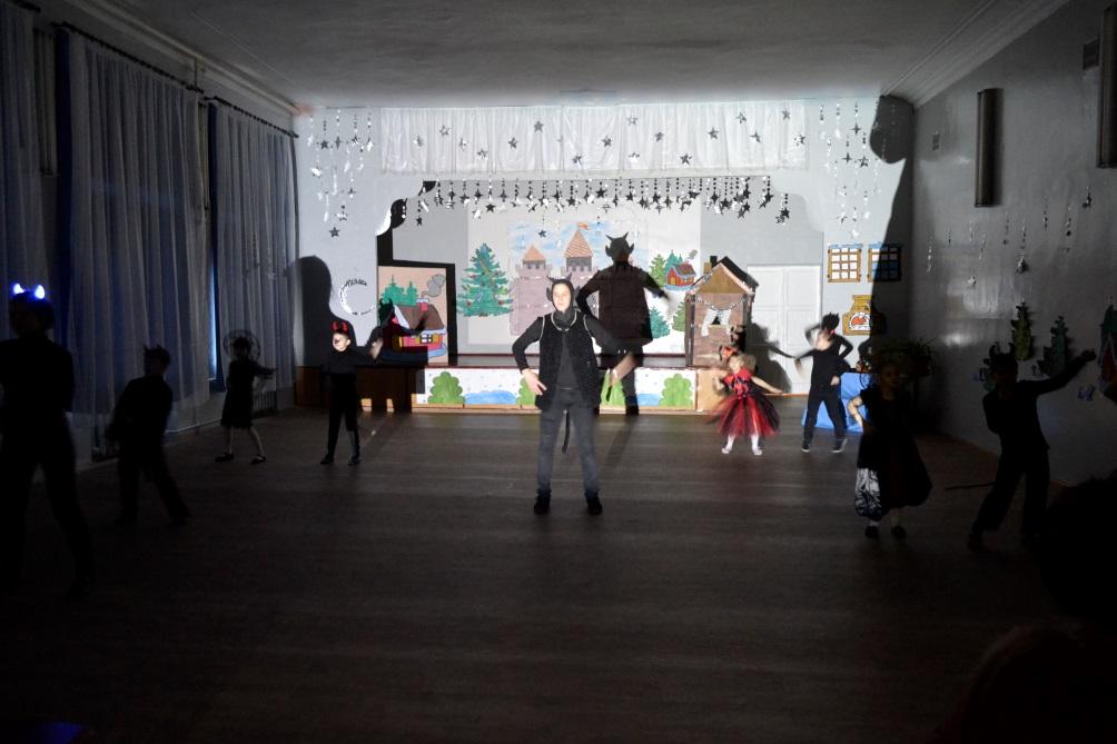Ведущий:Последний день перед Рождеством прошел. Зимняя, ясная ночь наступила. Глянули звезды. Месяц величаво поднялся на небо посветить добрым людям и всему миру, чтобы всем было весело колядовать и славить Христа. Морозило сильнее, чем с утра; но зато так было тихо, что скрип мороза под сапогом слышался за полверсты. Еще ни одна толпа парубков не показывалась под окнами хат; месяц один только заглядывал в них украдкою, как бы вызывая принаряживавшихся девушек выбежать скорее на скрипучий снег. Тут через трубу одной хаты клубами повалился дым и пошел тучею по небу, и вместе с дымом поднялась ведьма верхом на метле.
