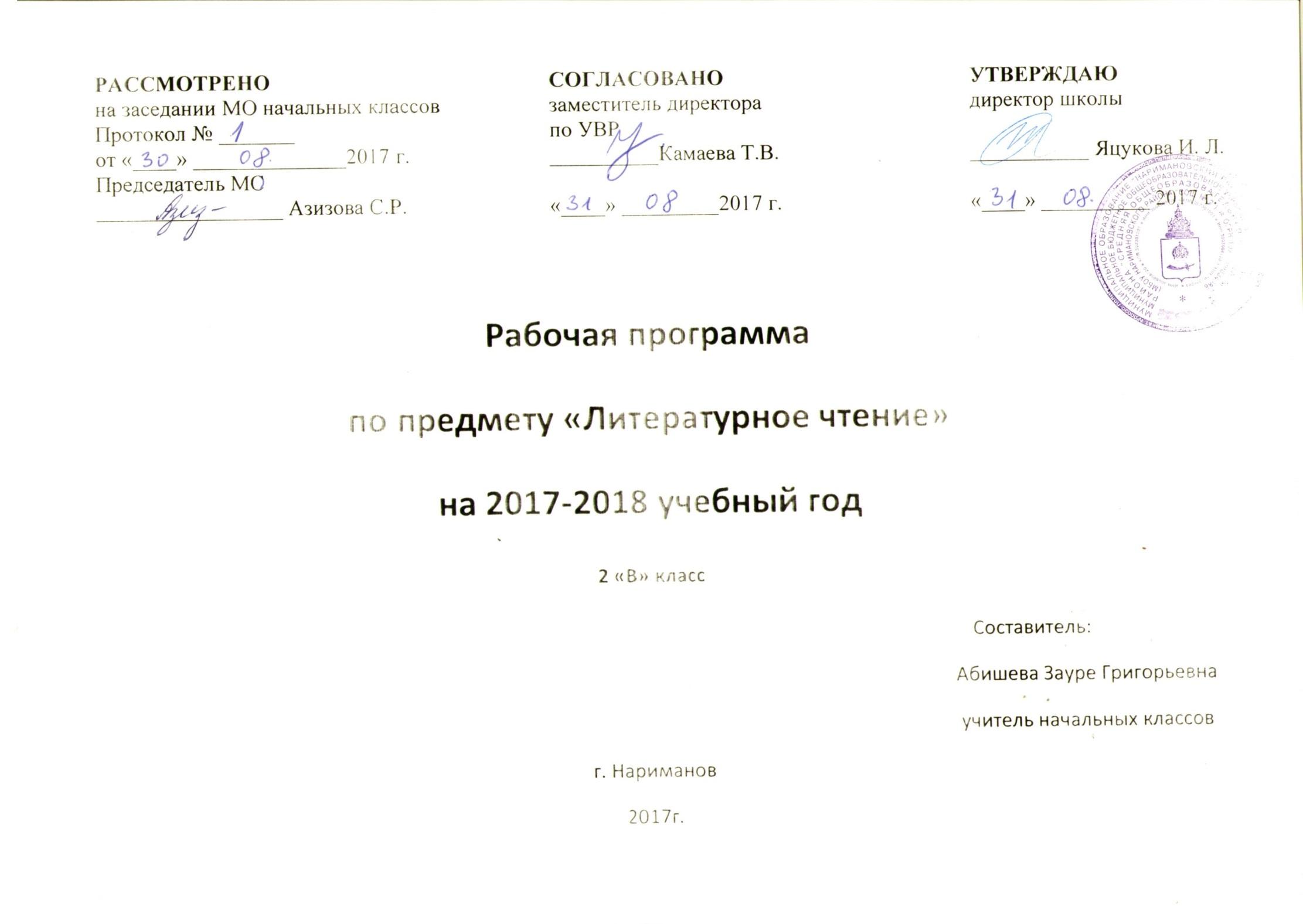 Рабочая программа по Литературному чтению разработана в соответствии с требованиями Федерального государственного образовательного стандарта начального общего образования, утверждённого приказом Министерства образования и науки Российской Федерации от 06.10.2009 № 373, приказом Министерства образования и науки РФ от 31 декабря 2015 г. №1576 «О внесении изменений в федеральный государственный образовательный стандарт начального общего образования, утверждённый приказом Министерства образования и науки Российской Федерации от 6 октября 2009 №373», в соответствии с «Положением о рабочей программе по учебному предмету (курсу внеурочной деятельности) педагога» МБОУ Наримановского района «СОШ №2», утверждённого приказом директора школы от 06.12.2016 №758/Л; на основе:
