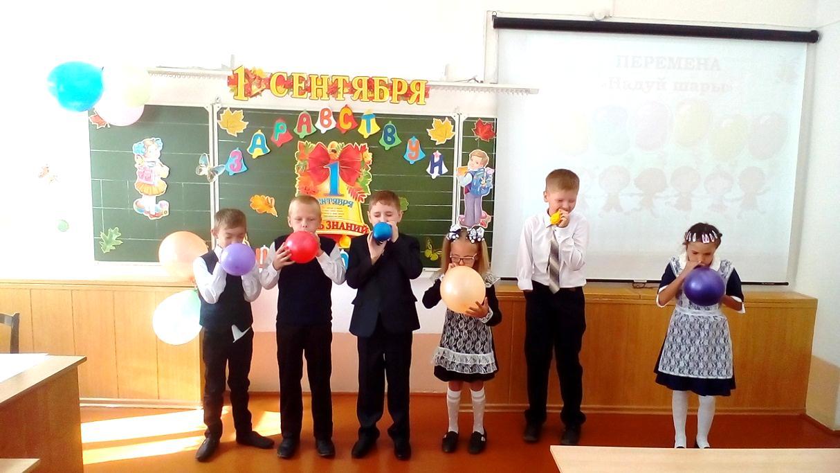 Оборудование: Красочно оформленный класс: воздушные шарики, плакаты «1 сентября», «Здравствуй, школа!», «День Знаний», цветы, листочки осенние, презентация, мультимедиа проектор, экран, компьютер, карточки с буквами (с,к,в), 6 карточек со словами, 6 шариков.