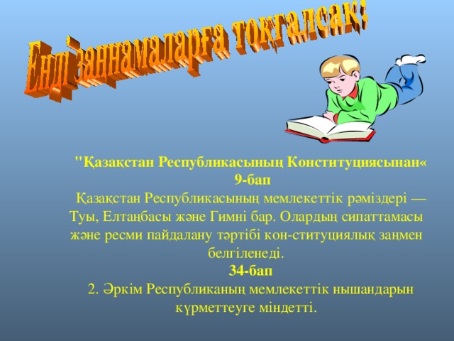 - М ұ ғалім: — Бала л ар, бүгінгі сабақ баска сабактардан ерекше болады, өйткені тек тарих пен қ ұ кық сабағы ғана емес. ин форма ти ка пәнімен байланыста өтеді. Осы сабақта сендер тәуелсіз еліміздің мемлеке тт ік рәміздері, олард ың құ кыктық с ип аты мен шығу тарихымен танысып. осының нәтижесінде компьютерді пайдаланып шығармашылық жұмыстар орындайсындар .