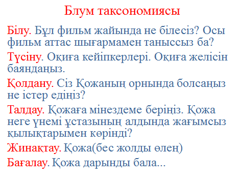 | 6 | Мағынаны тану Блум таксономиясы | 10 | Үлестірме материалды таратады | Материалды меңгереді, пікір алысады, бірлесіп жұмысқа дайындалады |