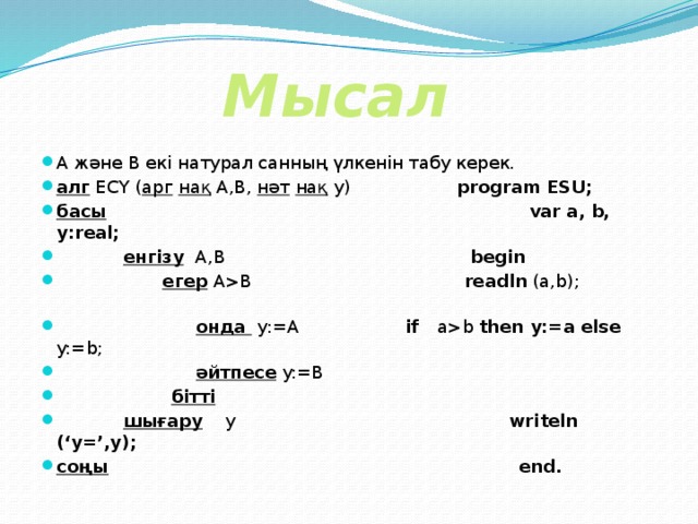 B readln (a,b); онда y:=A if ab then y:=a else y:=b; әйтпесе y:=B бітті шығару у writeln (‘y=’,y); соңы end. " width="640"