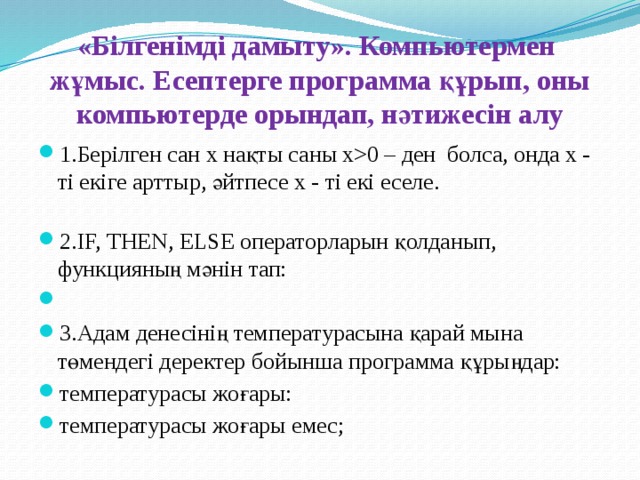 0 – ден болса, онда х - ті екіге арттыр, әйтпесе х - ті екі еселе. 2.IF, THEN, ELSE операторларын қолданып, функцияның мәнін тап: 3.Адам денесінің температурасына қарай мына төмендегі деректер бойынша программа құрыңдар: температурасы жоғары: температурасы жоғары емес; " width="640"