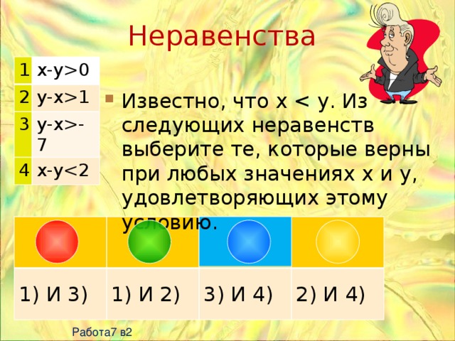 -5 4 y-xy-xИзвестно, что x y. Из следующих неравенств выберите те, которые верны при любых значениях x и y, удовлетворяющих этому условию. 1) И 3) 1) И 2) 2) И 4) 3) И 4) Работа7 в1 " width="640"