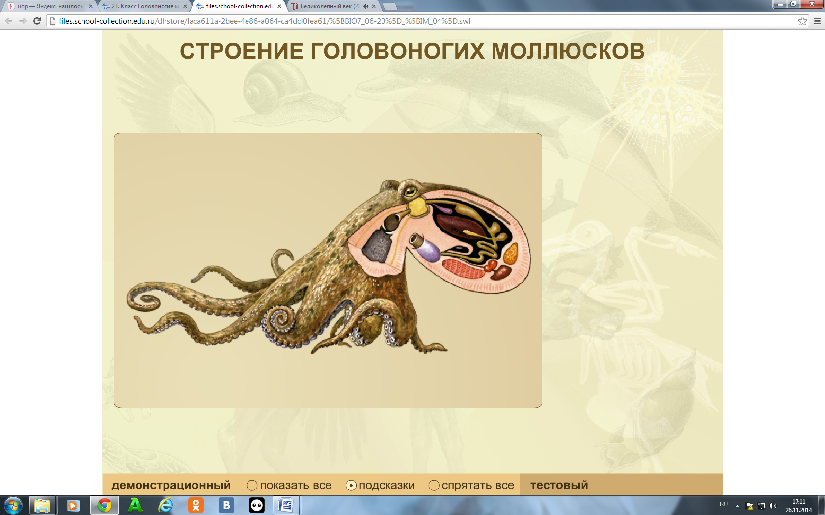 а) мидия; в) каракатица; б) виноградная улитка; г) осьминог обыкновенный.