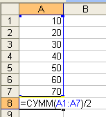 №10 Чему будет равно значение ячейки А8, если в нее ввести формулу =СУММ(A1:A7)/2: