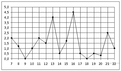 В2. На рисунке жирными точками показано суточное количество осадков, выпадавших в Мурманске с 7 по 22 ноября 1995 года. По горизонтали указываются числа месяца, по вертикали — количество осадков, выпавших в соответствующий день, в миллиметрах. Для наглядности жирные точки на рисунке соединены линией. Определите по рисунку, сколько дней из данного периода выпадало менее 3 миллиметров осадков.