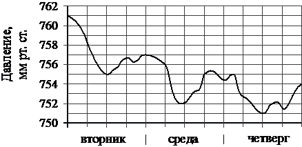 На рисунке изображён график изменения атмосферного давления в городе Энске за три дня. По горизонтали указаны дни недели и время, по вертикали – значения атмосферного давления в миллиметрах ртутного столба. Укажите значение атмосферного давления (в мм рт. ст.) в среду в 18 часов вечера. Ответ дайте в мм рт. ст.
