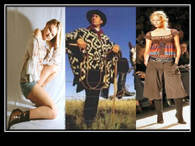 - The clothes in style of Gaucho became fashionable in 70th years of the XX-th century. It is clothes in the spirit of cattlemen of prairies of a Spanish-American Indian origin: various poncho, wide-brimmed hats with the superficial crown, carelessly tied scarf, leather boots, baggy trousers (as in the Argentina national suit).