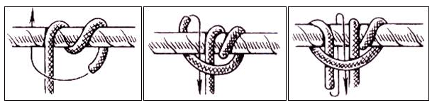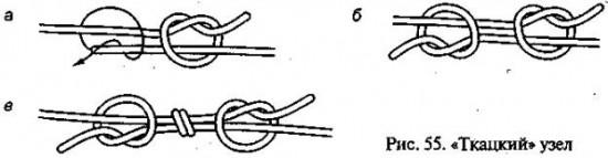 Ткацкий узел используется для связывания двух веревок одинакового диаметра. Состоит он из ряда страховочных узлов и, поскольку имеет тенденцию сползать, требует дополнительно контрольных узлов. Как завязать ткацкий узел? Накладываем две веревки одна на другую, вяжем контрольный узел сначала с одной стороны, потом с другой, стягиваем два узла, а на концах завязываем еще по одному страховочному узлу.