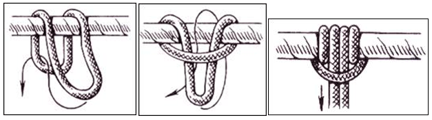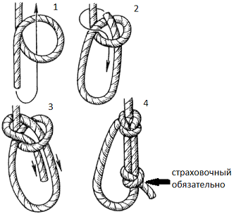 Используется для временного крепления, либо для тех случаев, когда после спуска нужно вернуть веревку. Один конец веревки при завязывании данного узла служит для удержания веса, другой – для развязывания узла.
