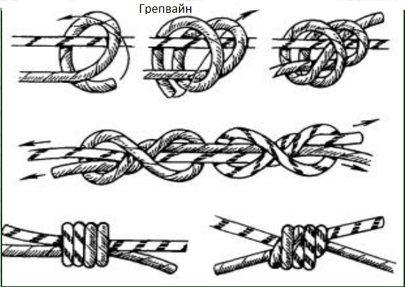Грейпван – более сложный узел, чем приведенные ранее. Это надежный узел, предназначенный для связывания двух веревок, лент и проч. Он не требует страховочных узлов, однако сильно затягивается при повышенной нагрузке.