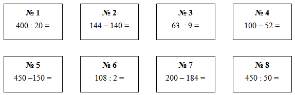 | – Я приготовила для вас еще одно интересное задание. Это блиц, быстрый ответ на вопрос. У вас на партах карточки с примерами, около каждого примера стоит номер. Задание: быстро и правильно решить примеры