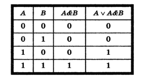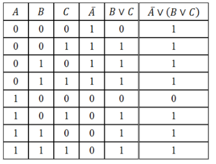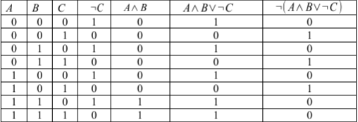 - Составить таблицу истинности логического выражения ¬𝐴∨(𝐵∨𝐶) Решение: Определим количество строк: Количество простых выражений – 𝑛=3, значит кол-во строк = 23+1=9. Определим количество столбцов: Количество переменных – 3. Количество логических операций и их последовательность: инверсия (𝐴¯); дизъюнкция, т.к. она находится в скобках (𝐵∨𝐶); дизъюнкция (𝐴¯∨(𝐵∨𝐶)) – искомое логическое выражение. Кол-во столбцов = 3+3=6. Заполним таблицу, учитывая таблицы истинности логических операций. - Следующее выражение ¬А&¬В