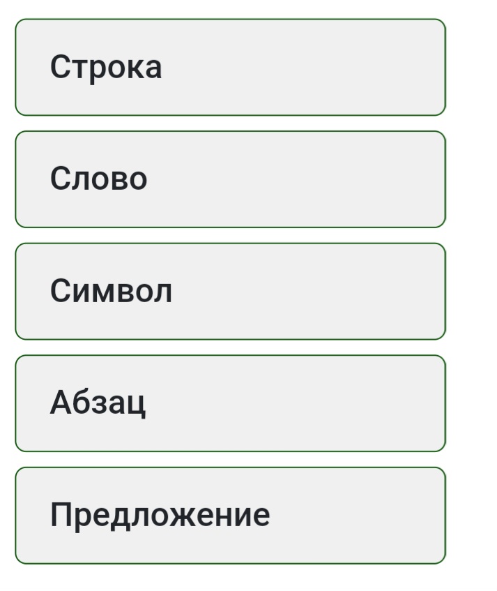 Минимальный элемент текстового документа. Произвольная последовательность букв и цифр, ограниченная с двух сторон знаком «пробел» или знаками препинания. Произвольная последовательность символов между левой и правой границами абзаца. Часть текста, находящаяся между двумя символами конца абзаца, при этом допускаются пустые абзацы. Произвольная последовательность слов в абзаце, заканчивающаяся точкой и пробелом либо последним символом абзаца.