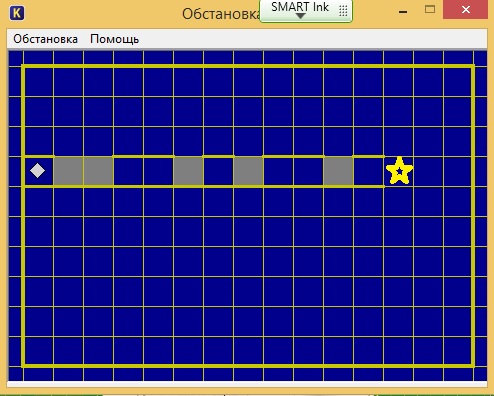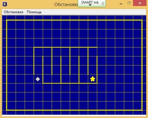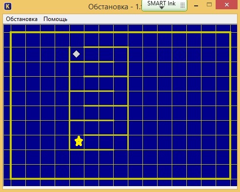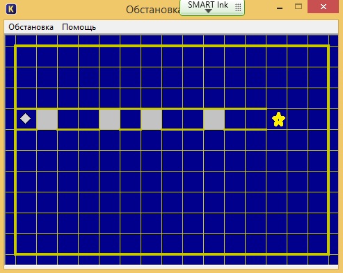Перевести исполнитель из начального положения в положение, отмеченное звёздочкой, закрасив при этом отмеченные клетки. Длина стен и расстояние между ними неизвестны.