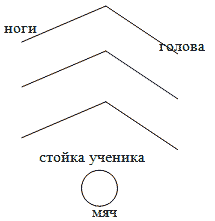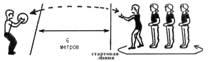 | Расстояние до ориентира 15 м. 10 играющих располагаются друг от друга на расстоянии 1,5 м. После свистка все играющие принимают положение – упор полулежа, а первый играющий посылает мяч по туннелю, образованному играющими; десятый, поймав мяч, бежит, перепрыгивая через каждого лежащего, и катит мяч девятому, а сам ложится в положение упор лежа. |