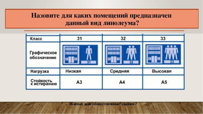 Укажите стрелками, где может применяться каждый из предложенных видов линолеума.
