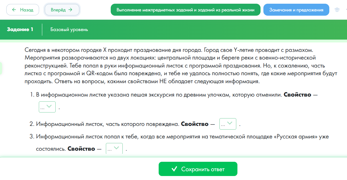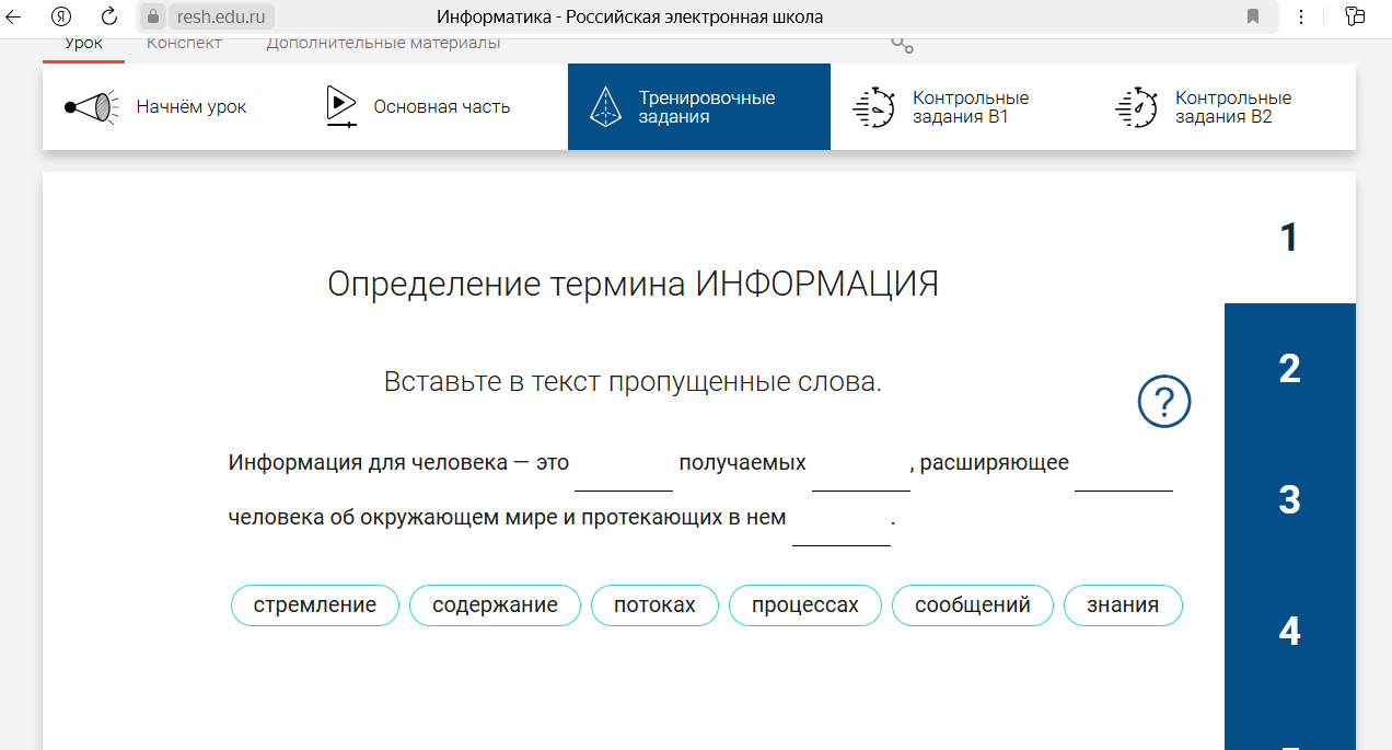 | Предлагает детям разделиться на две группы: (выбрать «нолики» или «единички») Задание для «Ноликов»: Вместе с учителем играют в игру «Верю – не верю» Определить истинность и ложность высказываний об информации. Верите ли вы, что... Байт — это единица измерения информации. Данные и информация — это одно и то же. Процессор компьютера обрабатывает информацию. Хранение информации возможно только на жестком диске. Интернет — это сеть, предназначенная для обмена информацией между компьютерами. Задание для «Единичек»: Предлагает пройти тест на ЦОК (ссылка для обучающихся https://academy-content.apkpro.ru/ru/my-tasks/item/Gu3DWss8 ) | Определяют истинность высказываний, фиксируют свои ответы с помощью знаков «0» - ложь и «1» - истина. Правильный результат: 10101. Предлагают проверить правильность своих ответов. Проходят тест за компьютерами и проверяют правильность своих ответов. | ||||||