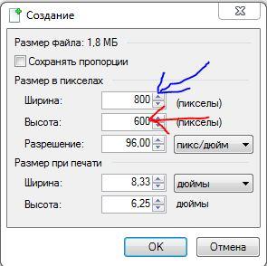Нам интересны ячейки, на которые указывает красная и синяя стрелка. Здесь мы вводим размер картинки. Мой совет: берите от 800 и 600 (для слабых компьютеров) до 1920 и 1080 (для мощных компьютеров). Когда мы введём нужный размер, надо будет нажать кнопку OK