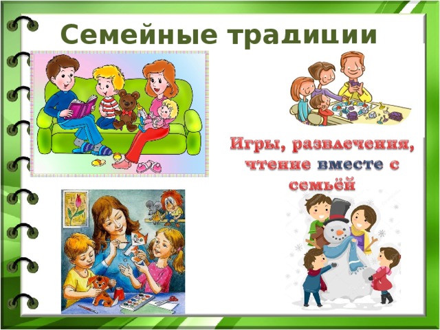 Традиций в семье может быть большое количество: это могут быть передаваемые из поколения в поколение семейные реликвии, семейные праздники, семейные фотографии, совместные вылазки на природу, а также совместное разгадывание кроссвордов.