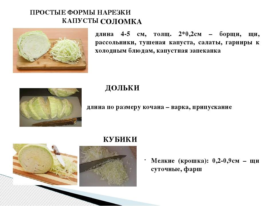 | К капустным овощам относится капуста белокочанная, краснокочанная, савойская, цветная, кольраби, брокколи. К луковым овощам относят – лук репчатый, лук зеленый, лук – порей, чеснок. Нарезка овощей способствует более равномерной их тепловой обработке, придает блюдам красивый внешний вид, улучшает вкус.