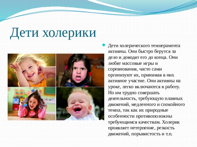 Эмоциональный, вспыльчивый, самоуверенный. Он не минуты не сидит на месте. Речь быстрая, громкая, с проглатыванием окончаний и очень эмоциональная. В компании всегда лидер и командир. Решения принимает быстро. Очень подвижен, неусидчив, непредсказуем, непоседа и спорщик. Холерик бесстрашен и настойчив.