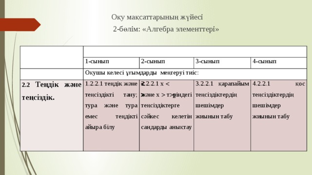 1.2.2.1 теңдік және теңсіздікті тану; тура және тура емес теңдікті айыра білу