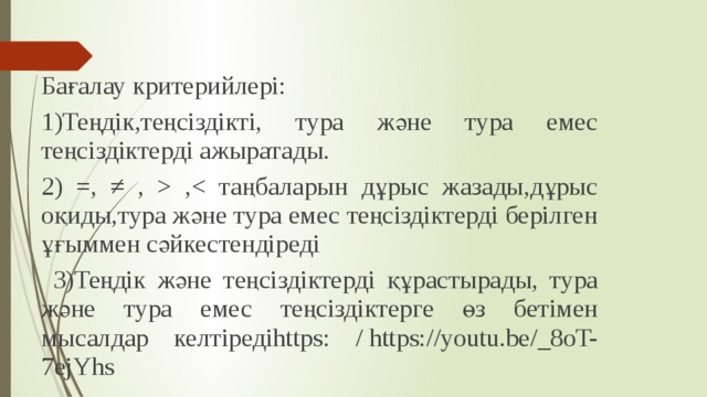 , 3)Теңдік және теңсіздіктерді құрастырады, тура және тура емес теңсіздіктерге өз бетімен мысалдар келтіредіhttps: / https://youtu.be/_8oT-7ejYhs " width="640"