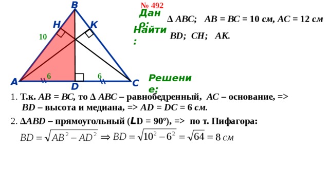 ВD – высота и медиана, = АD = DC = 6 см. 2. ∆АВD – прямоугольный ( L D = 90º), = по т. Пифагора: " width="640"