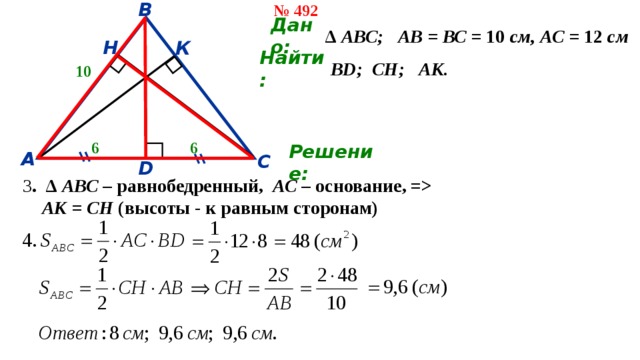 ∆ АВС; АВ = ВС = 10 см, АС = 12 см