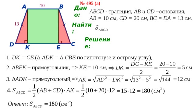 АВСD - трапеция ; АВ и СD – основания, АВ = 10 см, СD = 20 см, ВС = DA = 13 см.