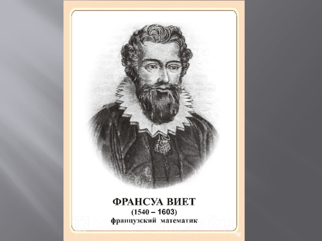 - Франсуа Виет- французский математик. Родился в 1540 в Фонтене – ле - Конт ,умер 13.12.1603 в Париже. По профессии юрист. В 1591 ввёл буквенные обозначения не только для неизвестных величин, но и для коэффициентов уравнений;благодаря этому стало впервые возможным выражение свойств уравнений и их корней общими формулами. Ему принадлежит установление единообразного приёма решений уравнений 2-й, 3-й и 4-й степеней. Однако символика Виета ещё была далека от той, которую сейчас используют.